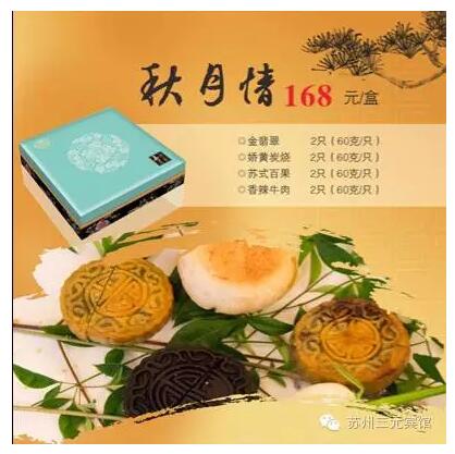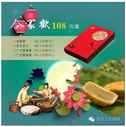 月饼是月亮在地上的影子,我们愿意摘下明月,将苏州胥城食品有限公司生产,苏州三元宾馆监制的2016年月饼礼盒,诚意奉上,愿您月明风清,阖家团圆!合家欢