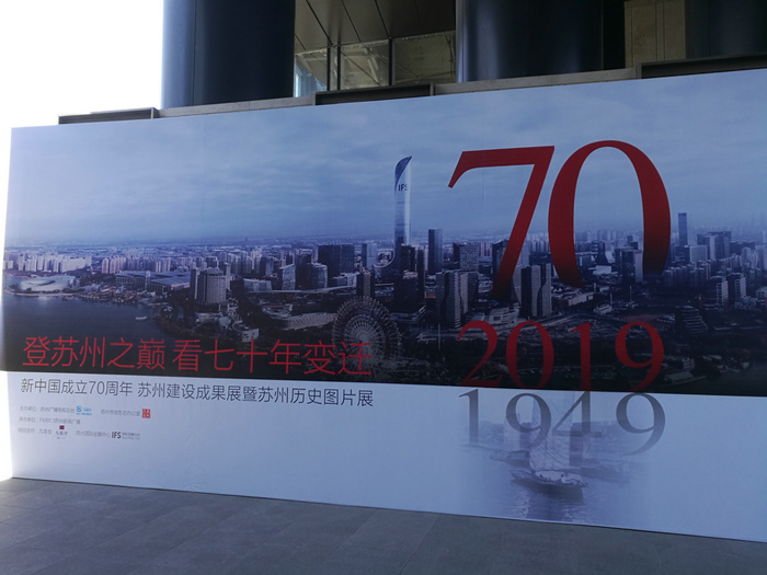 国金中心——苏州之巅,从95层远眺,苏州工业园区的壮阔景色尽收眼底,苏州工业园区是苏州改革开放生动实践的实景展示。展览设置东、西两个展区。西区为新中国成立70周年苏州建设成果展,一张张精美的照片,反映了新中国成立以来、特别是“十八大”以来,在党的领导下,苏州在农业、水利、工业、科技、交通、生态、城建、文化、教育、体育等多个领域取得的辉煌成绩。东区为苏州历史图片展,按照古城新生、百姓生活、百业行当、古城旧影等四个主题展示苏州珍贵历史图片130多幅。一幅幅苏州人民欢庆苏州解放的欢乐场面和在党的领导下苏州城市治理新起点的历史画面;一张张苏州老街、水巷、老宅、古迹的老照片;老百姓的衣食住行、工作和生活状态;各式各样的老行当。图片带着观众的思绪穿过七十年时光,一代人共同的回忆历历在目。