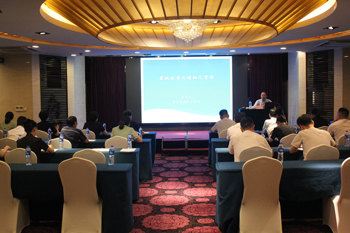 匡家庆教授做了《星级标准与精细化管理报告。结合复核工作实际案例,从星级标准必备项目检查表、设备设施评分表、饭店运营质量评价表等三个方面做了独到讲解从新标准特点的“六个强调”到必备项目检查的要点、再到关注三个环节的落实情况,详细阐释了复核工作的意义、要求、方法、工作流程等内容将精细化管理内容穿插在星级标准的解说中,课程讲解过程中教授理论联系实际,讲课生动有趣,课堂气氛十分活跃。