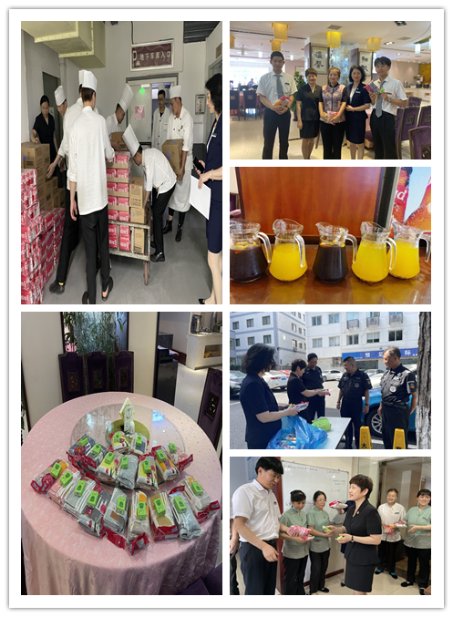 为保证在这酷暑季节员工的身体健康,餐饮部每天自制各类冰饮供宾馆当班员工消暑,宾馆分工会积极策划组织防暑降温慰问活动,并于7月19日在分工会主席沈洁红带领下,分别到宾馆各个岗位上为每个员工送上毛巾、风油精、饮料等防暑降温慰问品,送去夏日的清凉,送去宾馆对员工的关爱。
