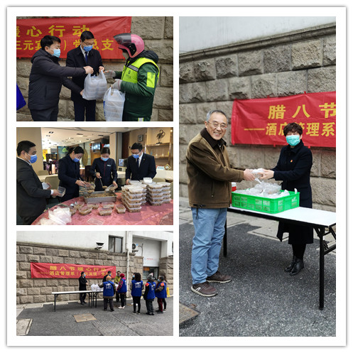 腊八节是我国的传统习俗,每逢这一天,人们祭祀祖先神灵,祈求丰收吉祥,有喝腊八粥、泡腊八蒜等习俗。为进一步增进邻里感情,使社区居民感受到大家庭的温暖,1月10日上午,酒管系(三元宾馆)党总支、分工会联合沧浪街道金狮社区开展“温馨铃声,校社共建”基层党建书记项目主题活动,为金狮社区孤寡老人、志愿者、环卫工人和卫院老教师们送上腊八粥,希望祛疫迎祥,来年事事顺利,阖家幸福。